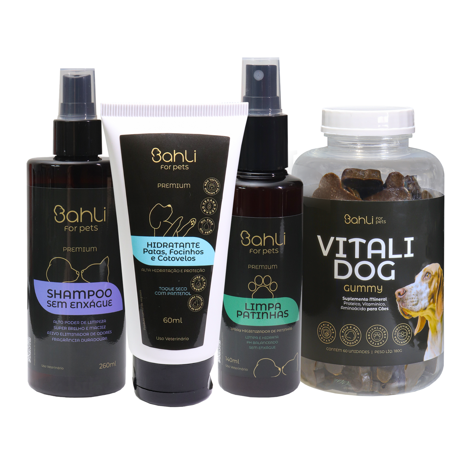 Kit Eu Amo: Limpa Patas + Hidratante + Shampoo + Vitali